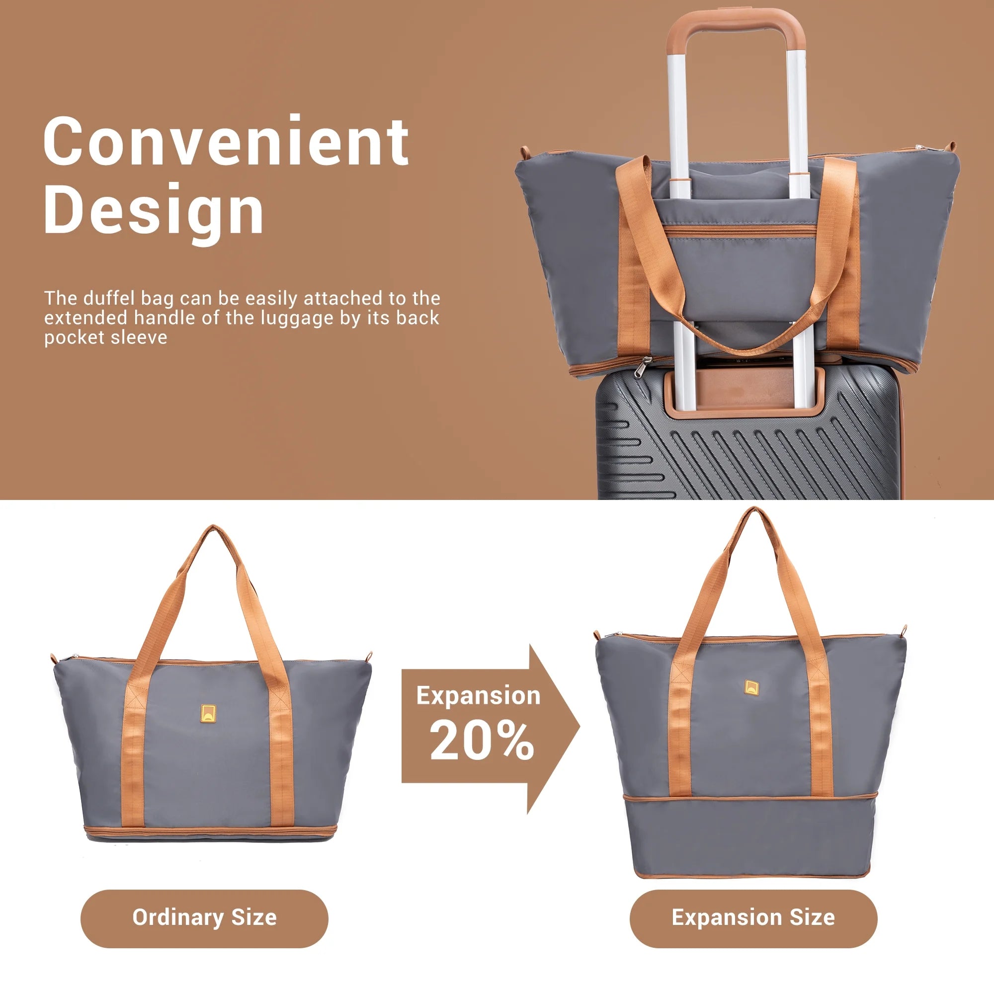 Multi-pocket duffel bag attaches to carry-on luggage for easy transport